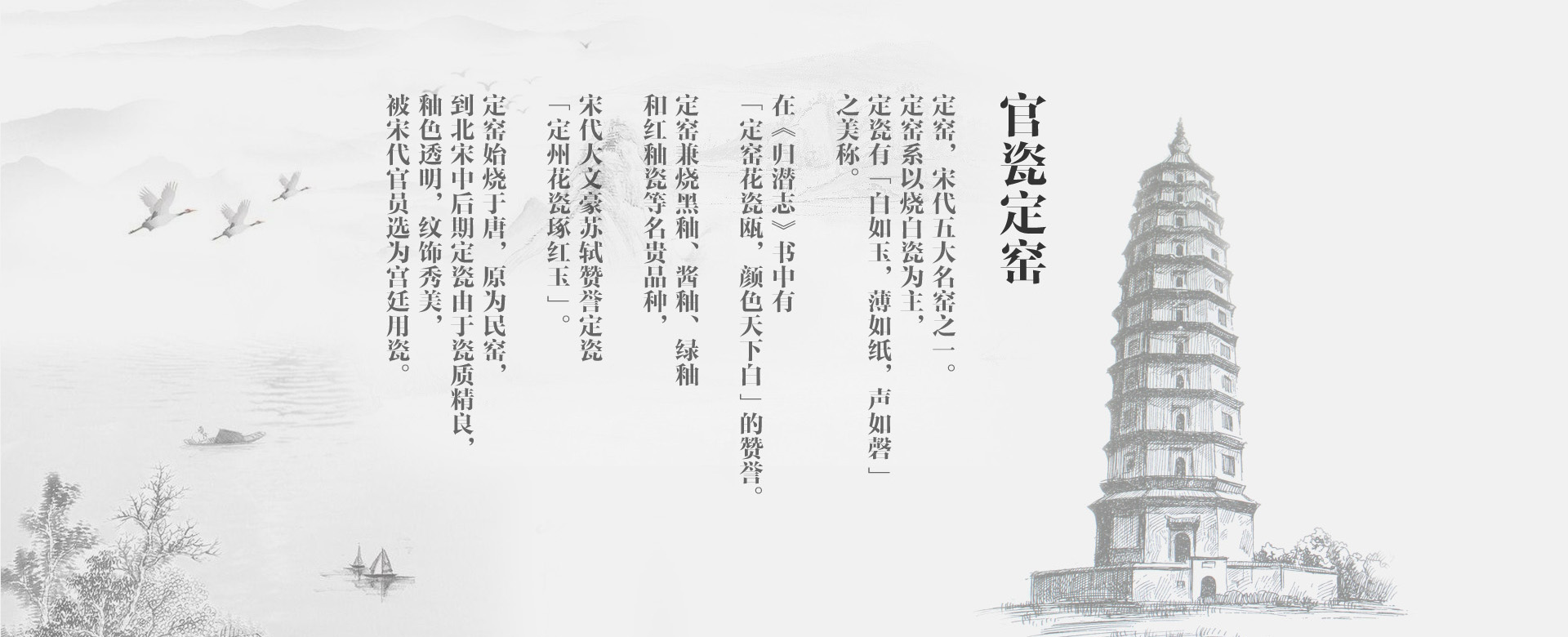 定窯為宋代五大名窯之一,窯址在今河北省曲陽澗滋村、野北村及東西燕村,在宋代屬定州,故名。創(chuàng)燒于唐,極盛于北宋及金,終于元。以產(chǎn)白瓷著稱,兼燒黑釉、醬釉和釉瓷,文獻(xiàn)分別稱其為“黑定”、“紫定”和“綠定”。